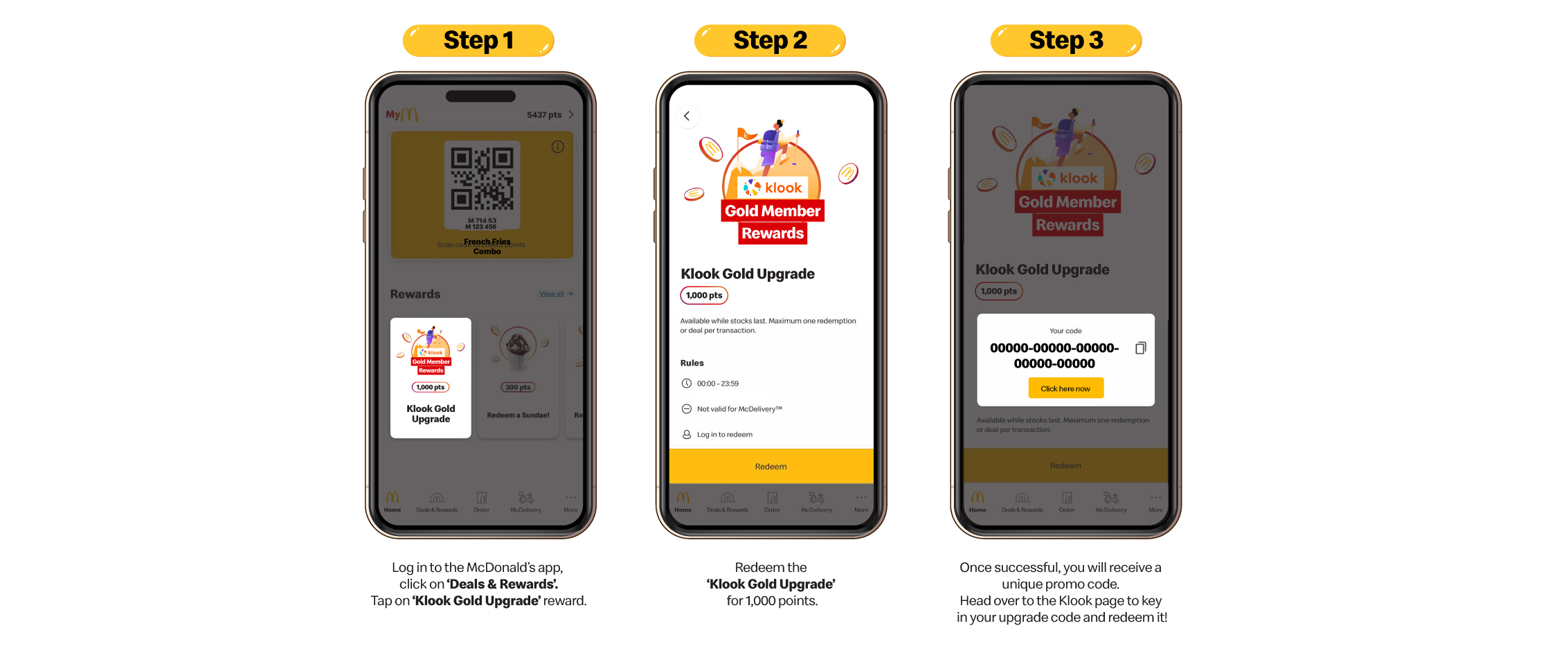 Klook Gold Upgrade codes are valid for a 1-month redemption validity period or 31 Jan 2026, whichever earlier. Any MyMcDonald’s points used to redeem the Klook Gold Upgrade will not be refunded nor can it be exchanged for cash.